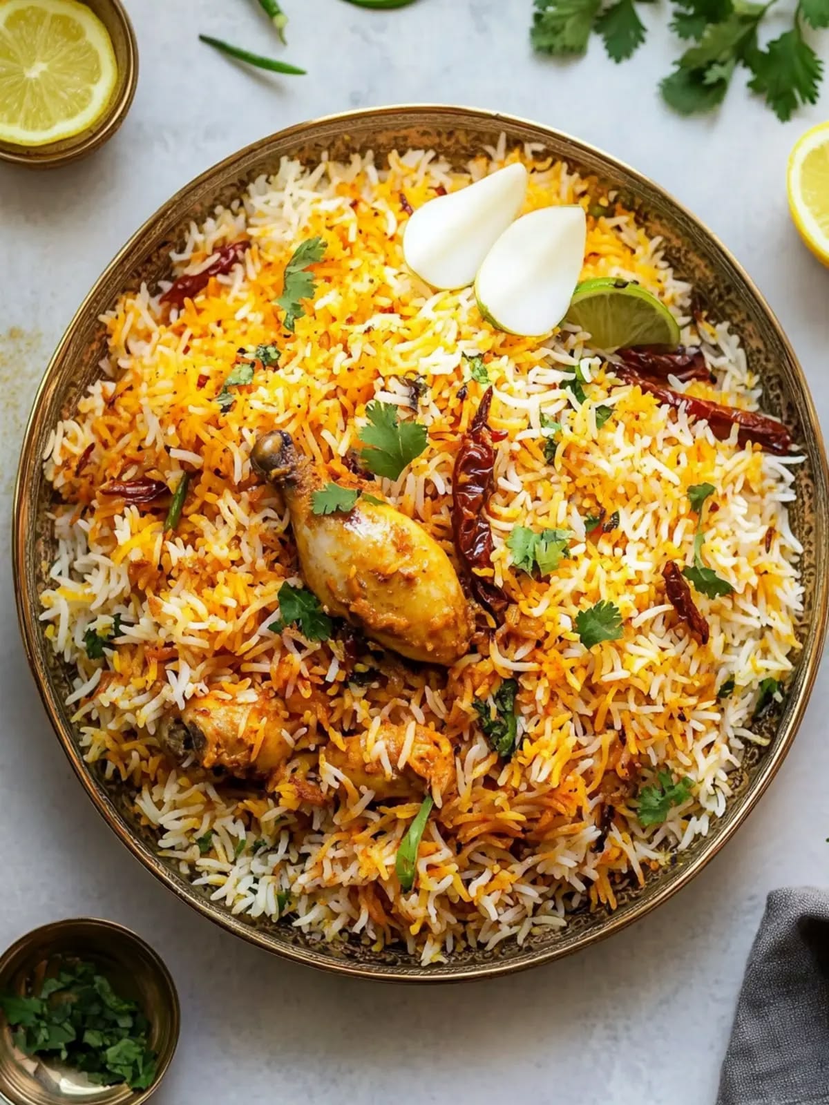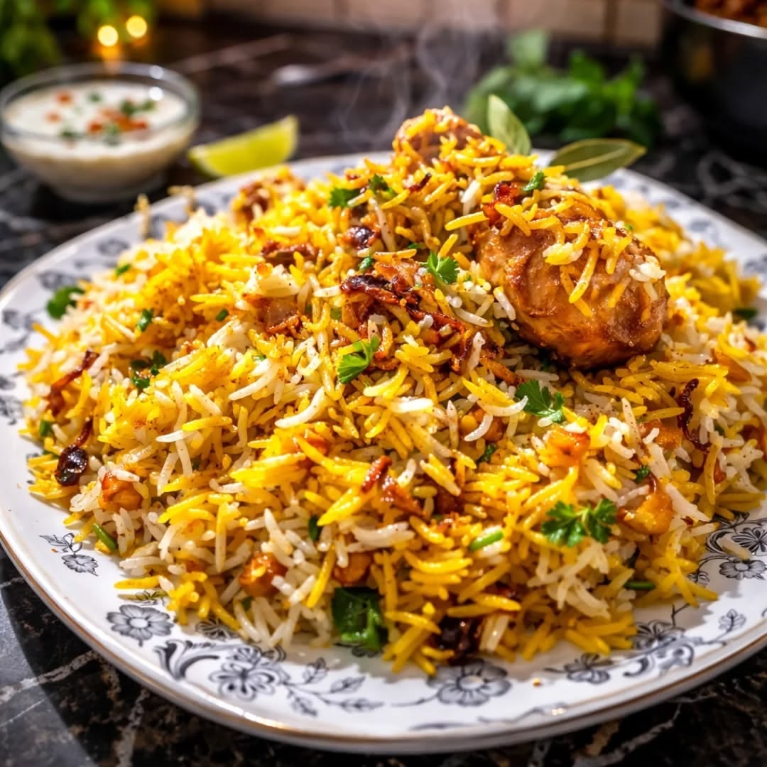 The half portion of biryani is prepared using premium long-grain basmati rice, layered with tender and juicy chicken pieces, and cooked with a blend of traditional spices. Made in dum style, the biryani locks in deep aroma and flavor, giving you a delicious experience in every bite. The rice is fluffy, the spices are perfectly balanced, and the chicken is soft and flavorful—everything you expect from a classic biryani.